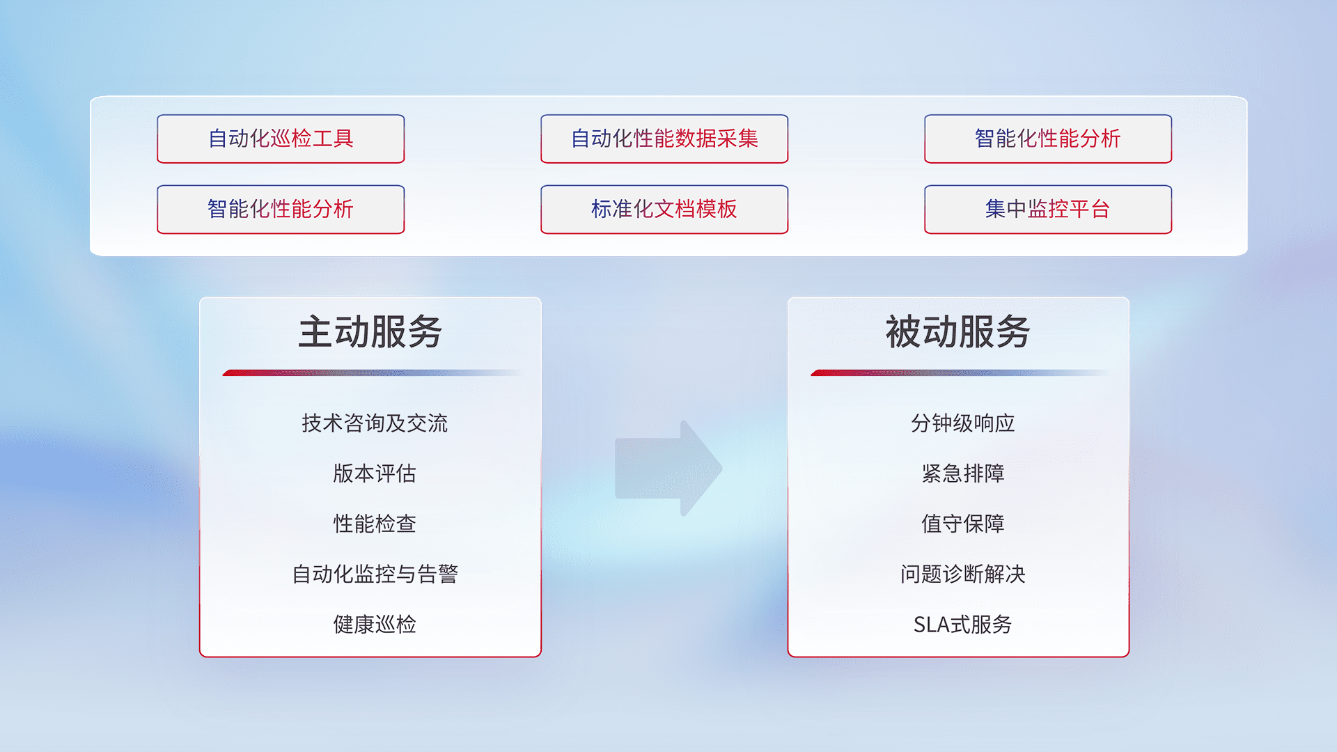 智能化工具和标准化文档,,,保障服务质量,,提供主动服务(包含技术咨询、、、版本评估、、性能检查、、、、自动化监控与告警、、、、健康巡检)和被动服务包含(分钟级响应、、、紧急排障、、、值守保障、、、问题诊断解决、、、SLA服务)。。。。